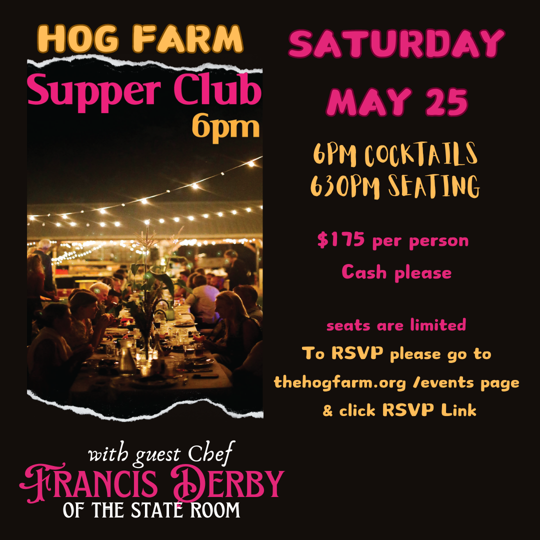 *The courses are served family style for an intimate experience among guests. Please note that due to the nature of the farm to table menu courses, we cannot modify and we must graciously decline any substitutions. If you or any of your guests have food allergies, please advise us in advance at our email gather@thehogfarm.org. Thank you kindly.